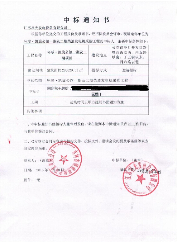 熱烈祝賀星光公司成功中標中國解放軍某部隊后勤保障部500kw柴油發(fā)..