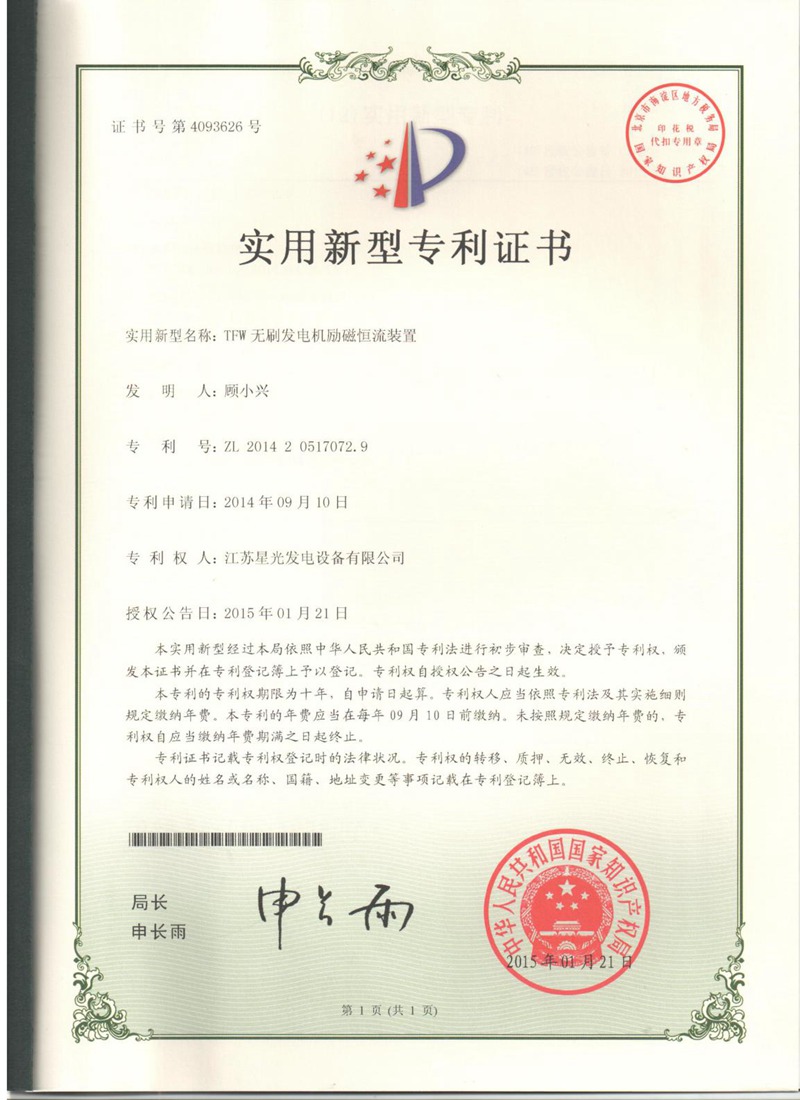 TFW 無刷發(fā)電機(jī)勵磁恒流裝置-專利證書